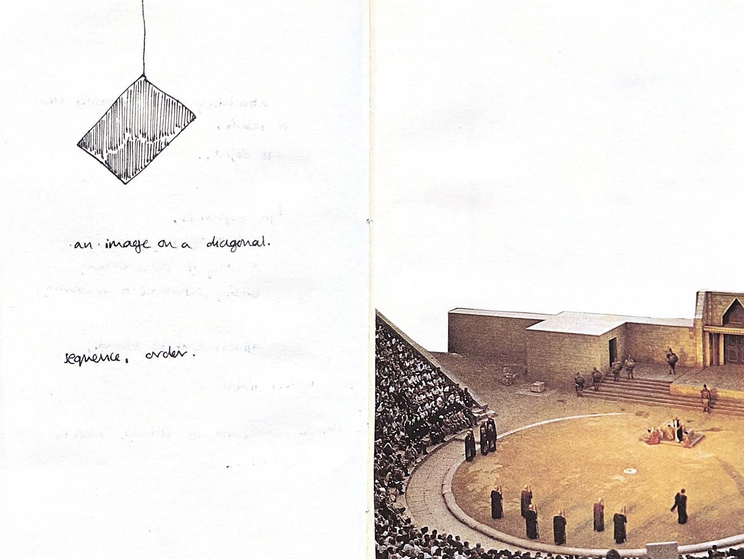 The diagonally positioned image on the front of the theatre book that I’ve been cutting up for collage. White background, dark, defined, diamond of an image, ochre at the bottom, sinking like it has mass.